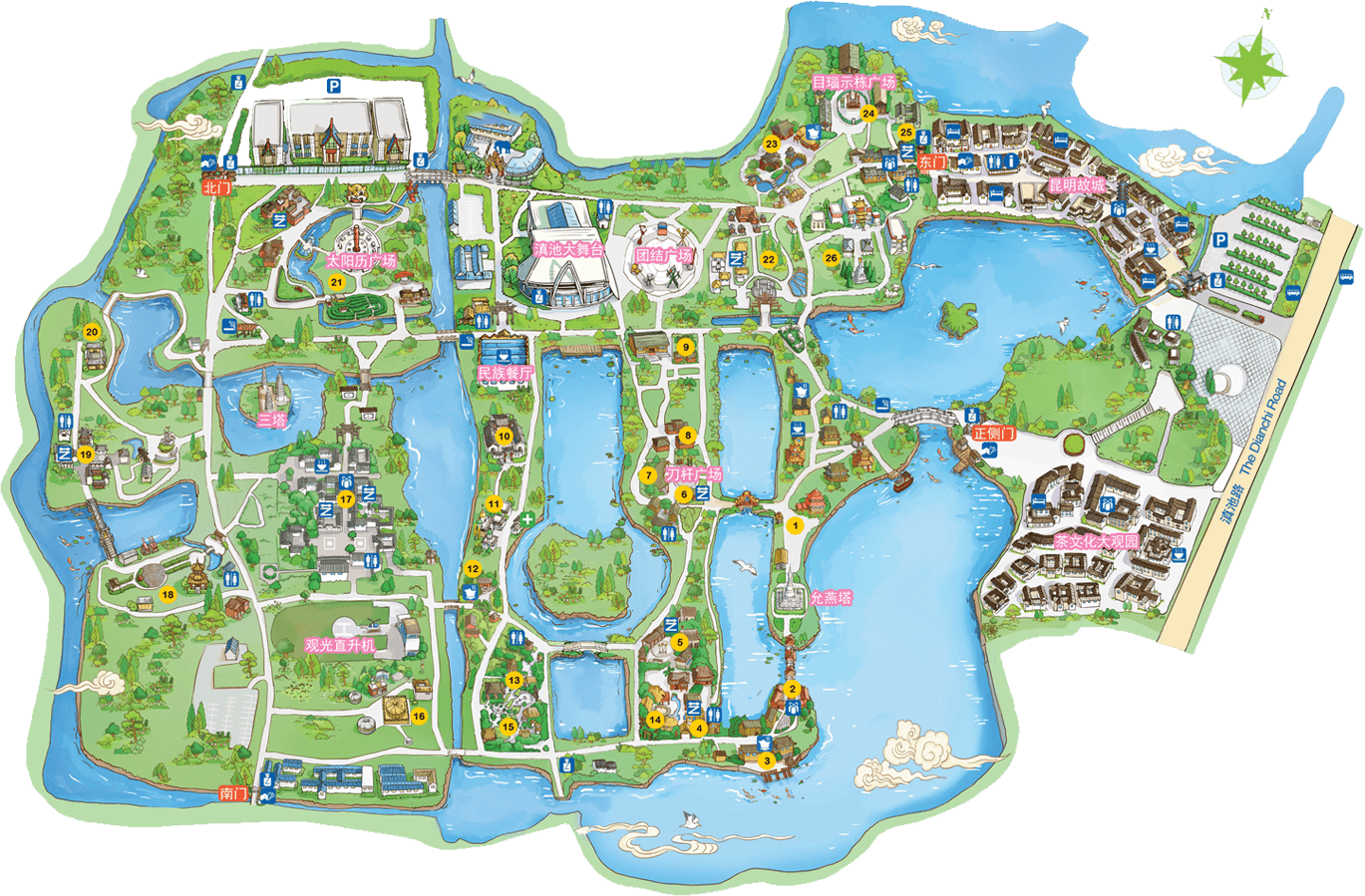 傣族人口約107萬人,主要分布在云南的德宏傣族景頗族自治州、西雙版納傣族自治州及瀾滄江流域的河谷壩子區(qū)域。傣族寨是進(jìn)入民族村的第一個村寨,占地面積27畝,三面環(huán)水,綠樹掩映。一幢幢“干欄式”傣家竹樓,通過蜿延的紅砂石小徑聯(lián)向肅穆的緬寺。巍峨壯觀的白塔,精巧玲瓏的風(fēng)雨橋,以及風(fēng)雨亭、水井、鐘亭等建筑充滿著傣家的濃郁風(fēng)情,是傣寨真實(shí)的民間景觀再現(xiàn)。一年一度的“潑水節(jié)”期間,這里都有活潑歡快的“象腳鼓舞...